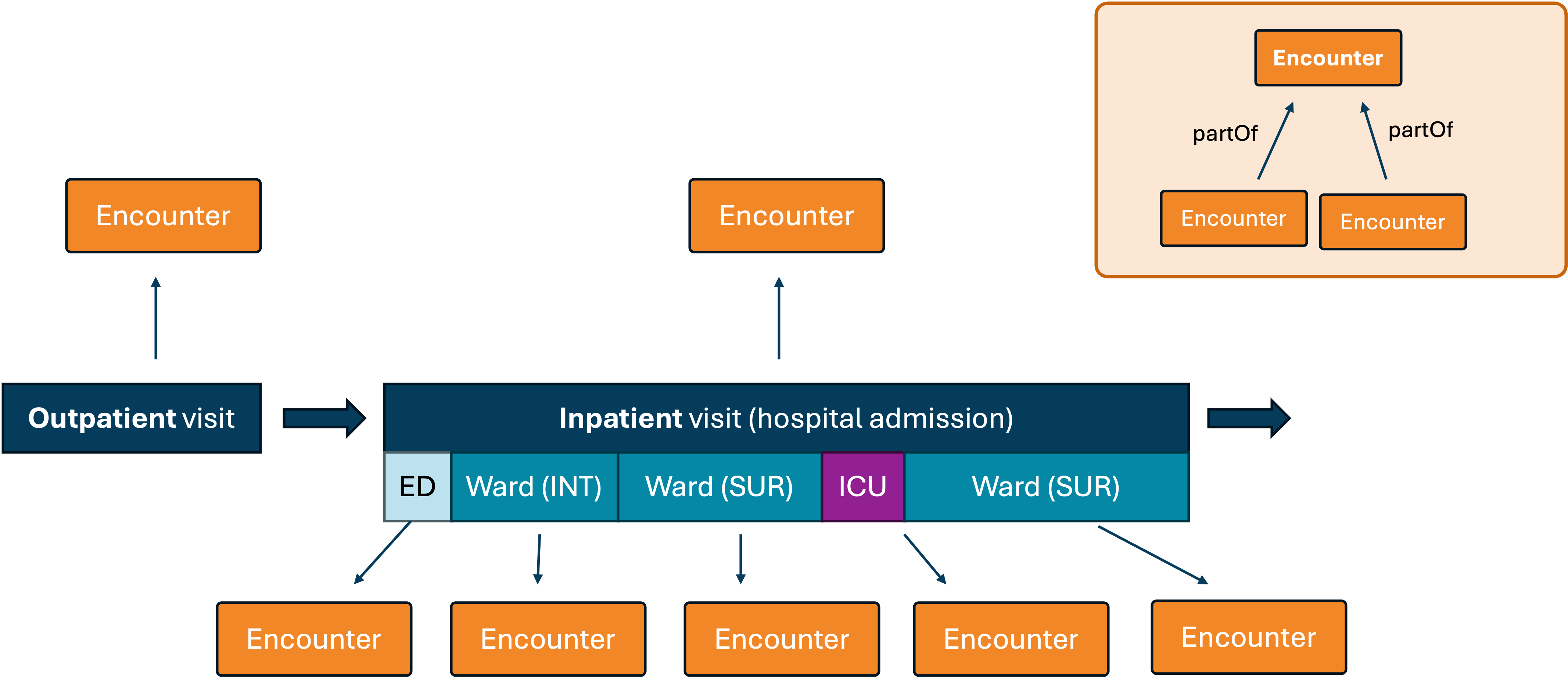Een Encounter beschrijft een bezoek aan het ziekenhuis en legt vast welk specialisme hierbij betrokken was. Dit kan een (dag)opname zijn, maar ook een poliklinisch bezoek. In het geval van een langere opname, kan het zijn dat een patiënt verschillende afdelingen in het ziekenhuis aandoet. Een opname kan bijvoorbeeld beginnen op de eerste hulp (SEH), waarna de patiënt wordt overgeplaatst naar de Acute Opname Afdeling (AOA) om, via de Intensive Care (ICU) op een reguliere afdeling terecht te komen.